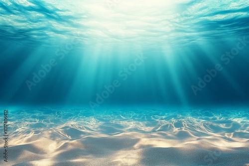 Underwater view of blue water with sunlight rays shining through and a sandy bottom.