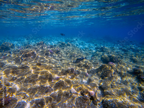 Underwater world landscape,colorful coral reef and blue clear water with sunlight and sunbeam. Maldives underwater wildlife, marine life, adventure snorkeling.