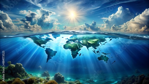 Underwater World Map With Sunlight and Clouds. Generative AI
