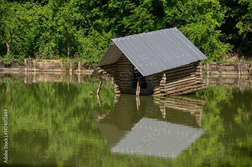 une petite cabane sur pilotis au bord d'un étang, le niveau de l'eau arrive jusqu'à la porte d'entrée