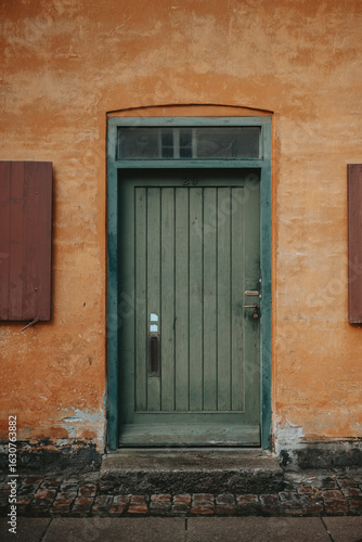 Une porte verte sur un mur orange