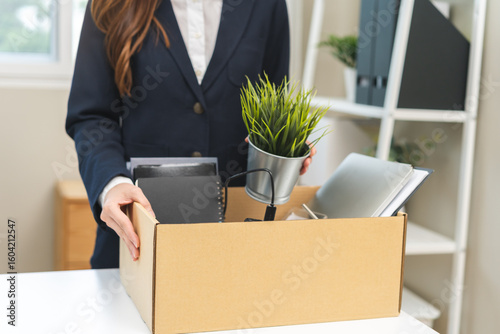 Unemployed, quite job, desperate young business woman resigning or fired, leave from company, female packing belongings, stuff into box cardboard, layoff or leaving, changing work, employment concept.