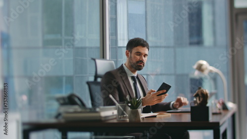 Unhappy employee calling telephone worried work problems sitting office desk.