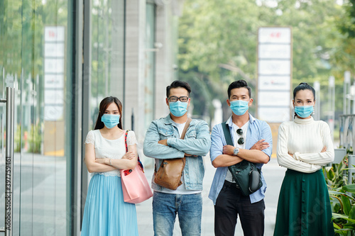 Unhappy serious young Vietnamese people in medical masks standing in street with arms folded and looking at camera