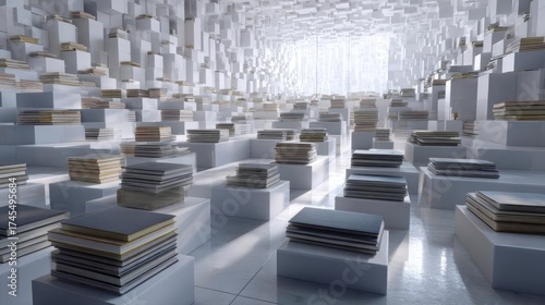 Unique collage of book collection in innovative library concept. An abstract architectural space filled with numerous stacked boxes.