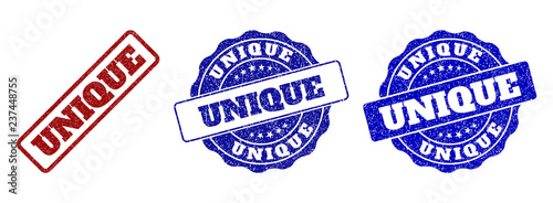 UNIQUE scratched stamp seals in red and blue colors. Vector UNIQUE overlays with grainy surface. Graphic elements are rounded rectangles, rosettes, circles and text captions.