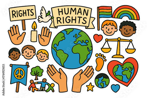 Unity and Peace Symbols. Human rights movement. Colorful Hand-drawn doodle Children illustration Human rights movement earth, open hands, dove, candle, protest