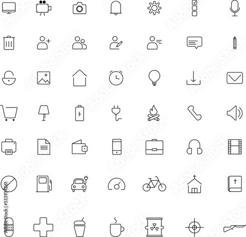 universal set of thin black icons on a white background (multimedia, medicine, fitness, family, transport, professions, travel, restaurant, hotel)