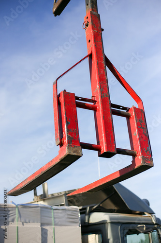 Unloading building blocks from a truck using a crane. Hydraulic manipulator.