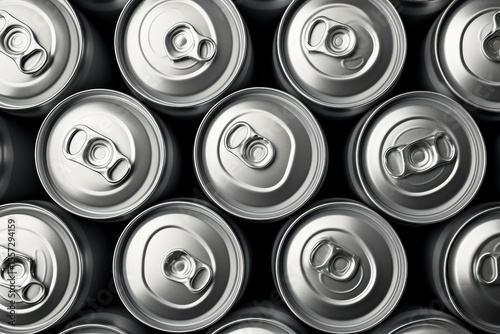 Unopened aluminum cans are arranged closely together, creating a visually appealing pattern with their ring pulls
