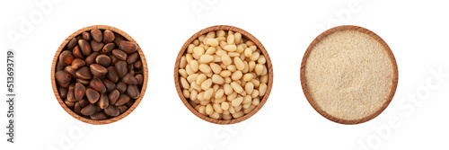 Unpeeled Cedar nuts. Whole Pine kernel nuts. Pine Kernel Flour on white background, Top view. Design element. Healthy eating. Natural organic food