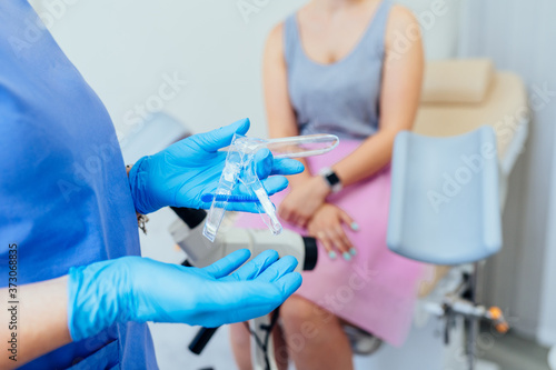 Unrecognizable female doctor gynecologist in gloves holding transparent disposable gynecological speculum ready for examination, working with patient.