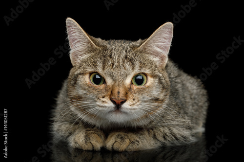 Unusual Cat with wide nose, stare suspects and lying on Isolated Black background, front view