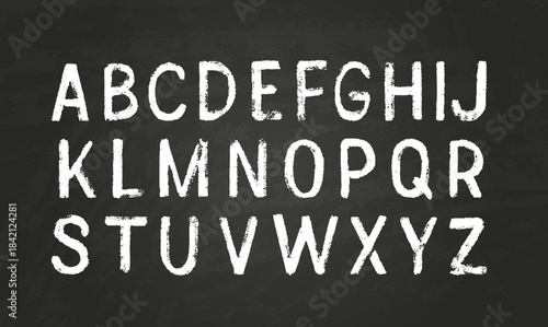 Uppercase letters of English alphabet white chalk texture font, chalk board typographic symbols, pencil crayon typeface