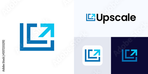 Upscale logo design for AI Image upscale the resolution and size digital image maintaining or enhancing quality, algorithms to add pixels and detail image, Logo arrow with transform square horizontal.