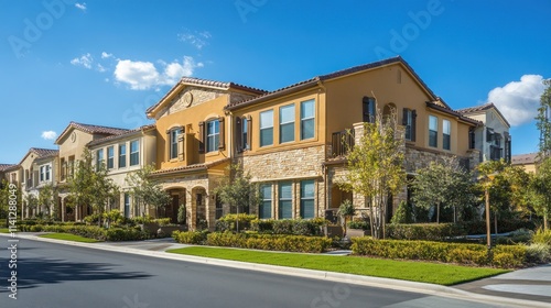 Upscale residential neighborhood with Mediterranean-style homes, landscaped yards, and a sunny sky.