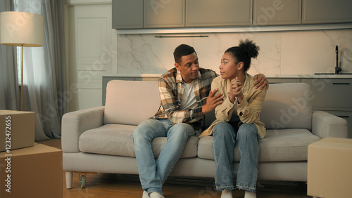 Upset African American married couple sad family renters home owners sit on sofa cuddling worried moving out apartment frustrated woman and man relocation bank debt credit mortgage eviction sale house