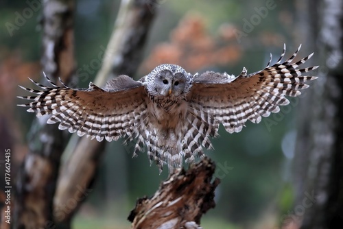 Ural owl (Strix uralensis), adult, on wait, landing, in autumn, Šumava, Czech Republic