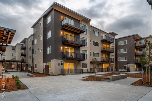 Urban affordable housing, compact multi-story building with a modern facade, small balconies, and a paved courtyard