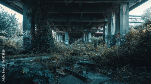 Urban decay with overgrown vegetation beneath a concrete structure in a deserted industrial area