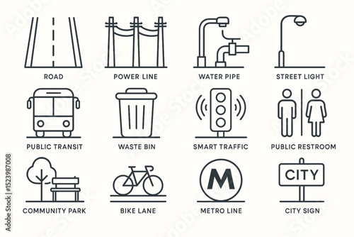 Urban infrastructure icons featuring transport, utilities, and public facilities