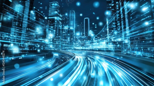 Urban Nightscape with Light Trails and Digital Effects in Blue
