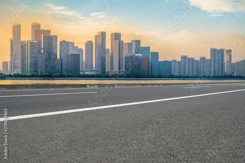 Urban road asphalt pavement and skyline of Hangzhou architectural landscape