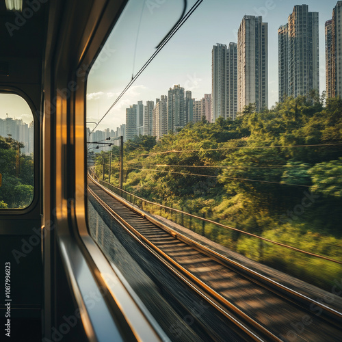 Urban train journey with cityscape views and lush greenery