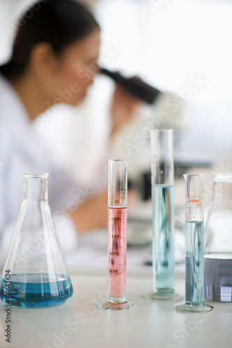 USA, New Jersey, Jersey City, Female scientist using microscope behind test tubes and flasks
