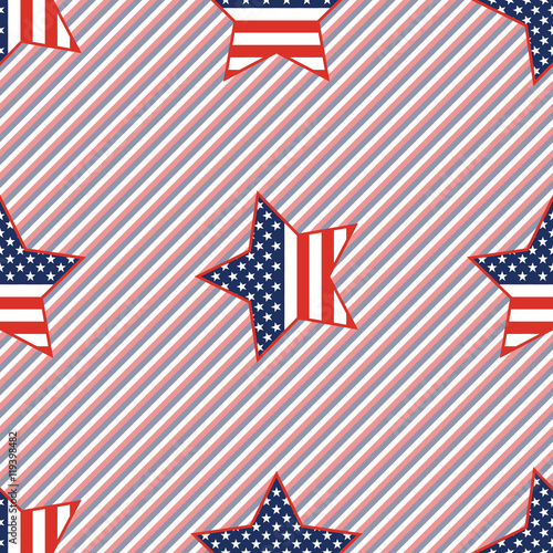 USA patriotic stars seamless pattern on red and blue stripes background. American patriotic wallpaper with USA patriotic stars. Wallpaper pattern vector illustration.