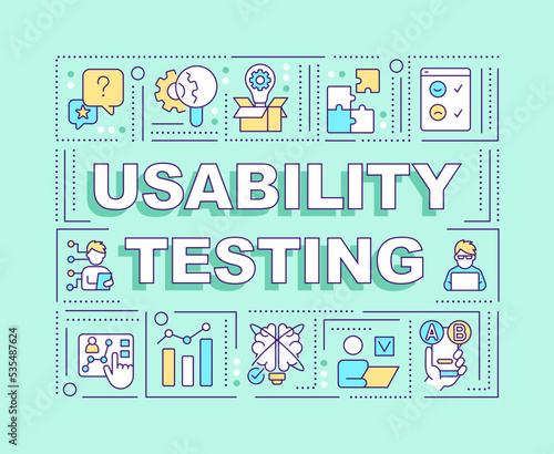 Usability testing word concepts turquoise banner. Behavioral research. Infographics with editable icons on color background. Isolated typography. Vector illustration with text. Arial-Black font used