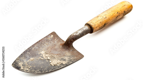 Used gardening tool with wooden handle and dirt on blade. Close-up of spade, shovel, tool, equipment, garden. White background.