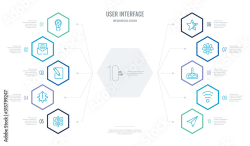 user interface concept business infographic design with 10 hexagon options. outline icons such as flying origami airplane, wi-fi, uploading file, bad settings, black star, upload setup