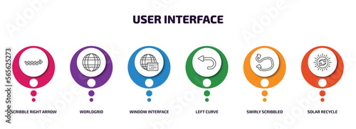 user interface infographic element with outline icons and 6 step or option. user interface icons such as scribble right arrow, worldgrid, window interface, left curve, swirly scribbled arrow, solar