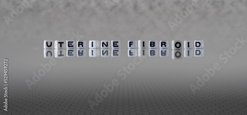 uterine fibroid word or concept represented by black and white letter cubes on a grey horizon background stretching to infinity