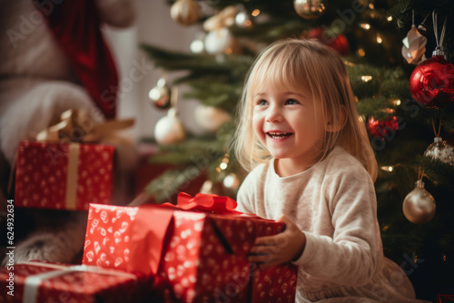 vA young excited child on Christmas morning opening presents