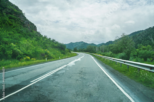 Vacation roadtrip landscape. Russian Altai mountains. Multa region. Holiday at home. Staycation concept. Long distanse road. Reduce carbon footprint. Sustainable lifestyle. Holiday trail. Local travel