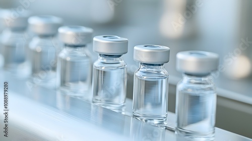 Vaccine Production Line in Industrial Facility - Glimmering Vials on Conveyor Belt Under Bright Lighting Showcasing Precision and Hygiene in Manufacturing Process