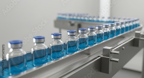 Vaccine Vials in Laboratory on Conveyor Belt in Medical Facility