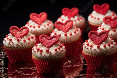 Valentines Day cupcakes decorated whipped cream, sprinkles and red hearts on dark background. Copy space. Greeting card.