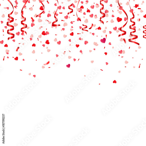 Valentines day red background with hearts. Love symbol. February 14. I love you. Be my valentine. Ribbon. Heart confetti.