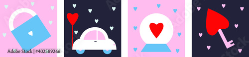 Valentine's Day vector flat cartoon illustration. Couple in love symbols. Car, hearts, key and lock. Cute romance geometric icon illustration.