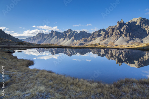 Vallée de La Clarée, reflet du massif des Cerces (3093 m), à droite les pointes de la Main de Crépin (2942 m), Hautes-Alpes