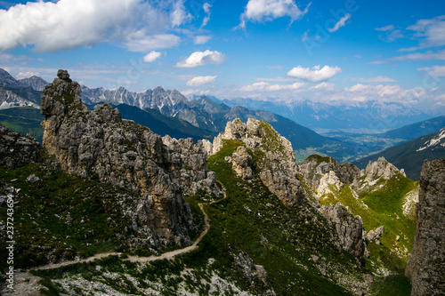 Valley in the Alps (Austria, Europe). Beautiful nature, high mountains, summer day, snowy peaks. Hike in the rocks, traveling with a backpack.