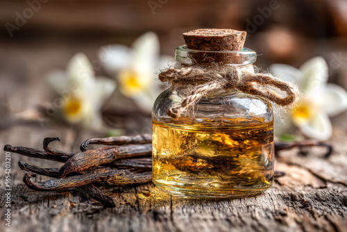 Vanilla bean and honey extract in a rustic glass jar on a wooden surface with soft floral background