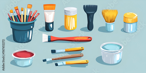 Variety of Art Supplies Neatly Arranged on Wooden Shelf