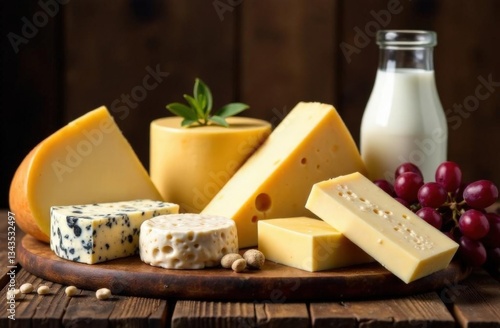 Variety of cheeses with milk, grapes, and almonds on wooden board