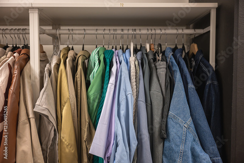 Variety of clothing on hangers organized on a rack in thrift store