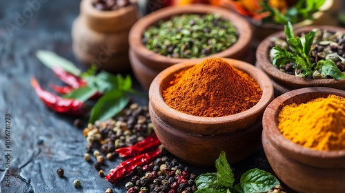Variety of colorful ground spices and whole peppercorns in rustic wooden bowls with fresh herbs and chili peppers on dark textured background, copy space