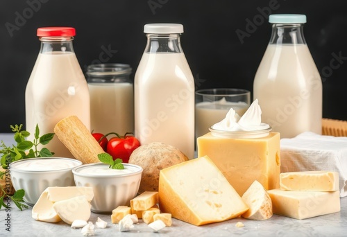 Variety of dairy products including milk, yogurt, cheese, and butter, cheese wedge, breakfast